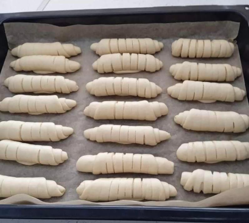 Oblikujte 36 jufkica na lagano pobrasnjenoj radnoj povrsini, a zatim jednu po jednu razvaljajte u elipsu, blago rastanjite i sa prstima, pa uvijte u kiflu.