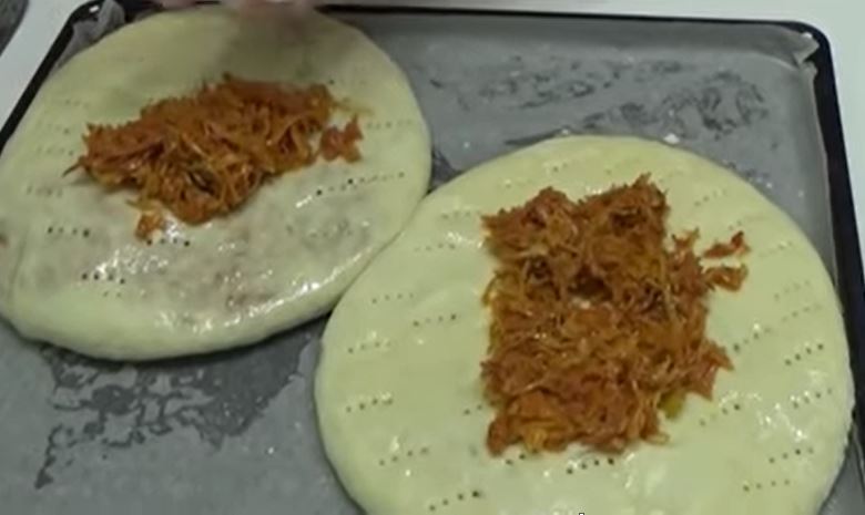 Pripremljene pogače izbockati viljuškom,premazati uljem i naneti malo fila preko.
