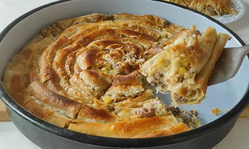 Šareni burek. Pita sa mesom i krompirim. Domaća pita od razvijane jufke.