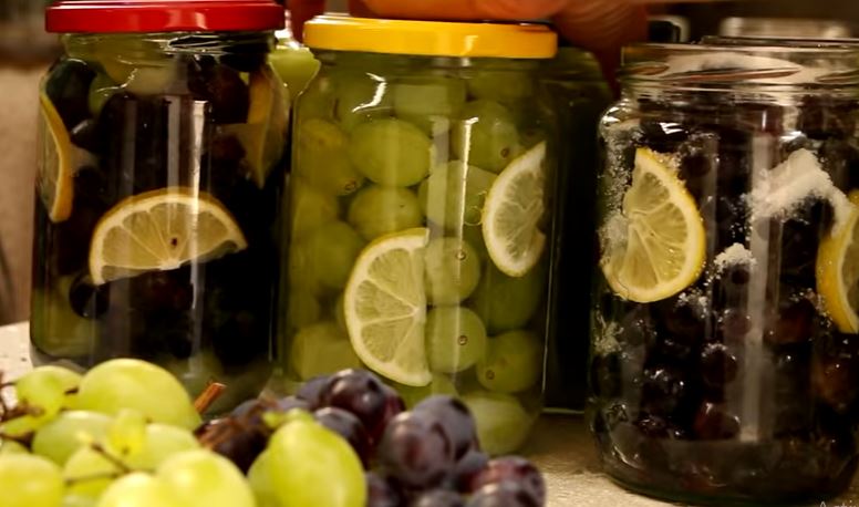 Grožđe operite i oslobodite od stabljike. Bobice stavite u teglu, takođe i kriške limuna. Ubacite šećer i vanilin šećer, nalijte hladnu vodu da prekrije voće i tegle dobro zatvorite odgovarajućim poklopcem.