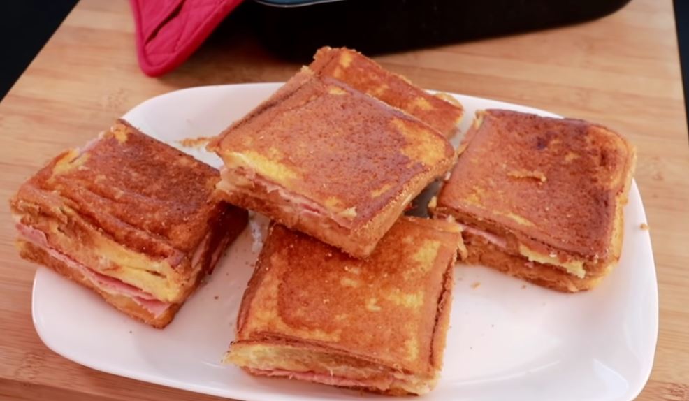 Stavite 3 kriške šunke i polivnu sira (100 g), preko stavite još 6 kriški hleba umočenih u smesu sa jajima.