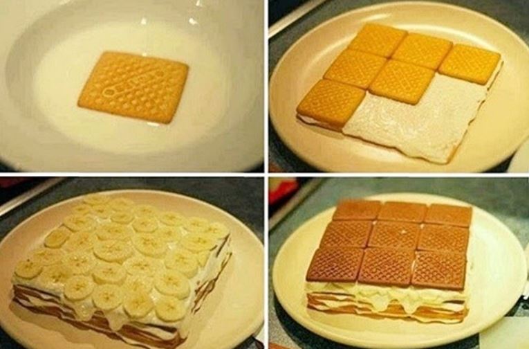 Po keksu stavite banane, koje ste prethodno izrezali na kolutiće i presuli sokom od limuna da ne pocrne i prelijete pudingom.