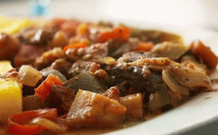Priprema: Isjeci patlidjane na kockice, posoliti i ostaviti da puste vodu. Isjeci luk i staviti u zagrijano ulje, dodati i bijeli luk, kad malo porumene. Dodati u serpu i komadice mesa, posoliti i pirjati, dodavati pomalo vode da nezagori. Kad meso malo omeksa, dodati oguljen i isjecen paradajz, kad je paradajz pustio svoju vodu u sve dodati isjecenu papriku.