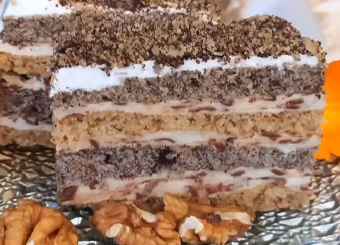 Filovati :Bela kora.fil,crna kora,fil,bela kora,fil,crna kora ,odozgo umućen posni šlag pa posuti sa makom i orasima.