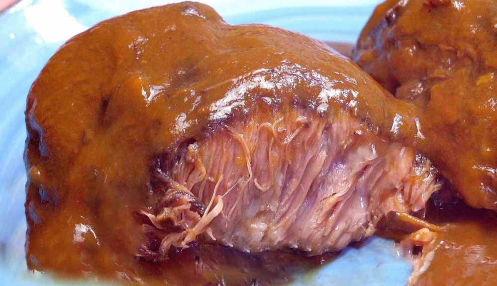 Poklopite i kuvajte na niskoj temperautri još 2-3 sata nakon ključanja. Zatim ponovo izvadite meso, a sav sos sipajte u blender i usitnite. Vratite u šerpu i vratite i meso. Uhvatite šerpu za ručke i pola protresite kako bi sos obložio meso, nemojte da korisitite kašiku. Kada krene da ključa isključite i jelo je gotovo.