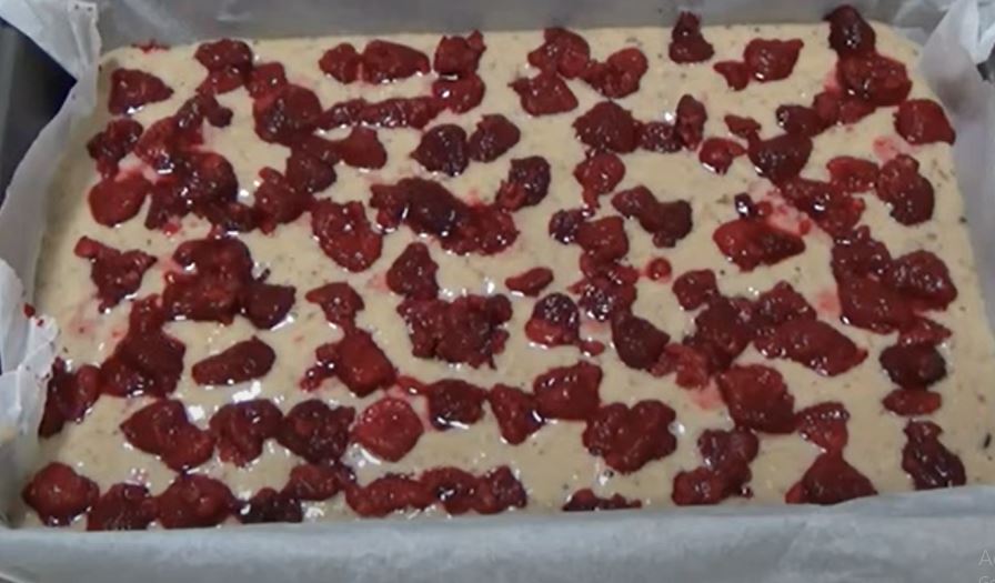 U pleh veličine 20×30 cm staviti papir za pečenje i sipati smesu za kolač. Preko smese rasporediti maline. Kolač peći u rerni zagrejanoj na 180 stepeni od 30 do 35 minuta. Kolač po želji posuti šećerom u prahu.