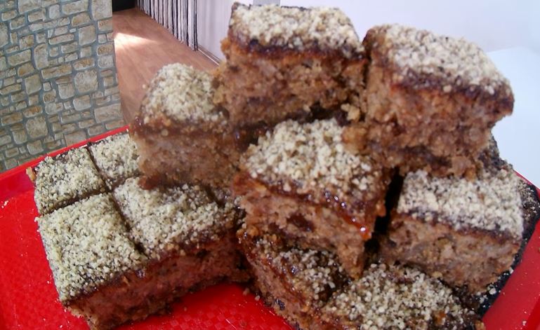 Prohlađen kolač premazati bilo kojim džemom i posipati mlevenim orasima.