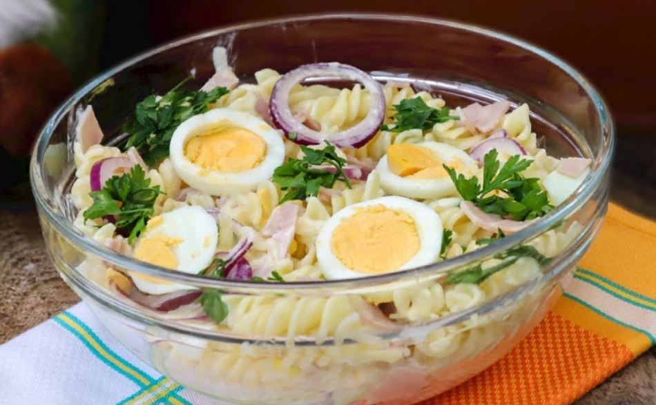 Ukusna salata sa pastom i šunkom sa povrćem, sočna i veoma fina.