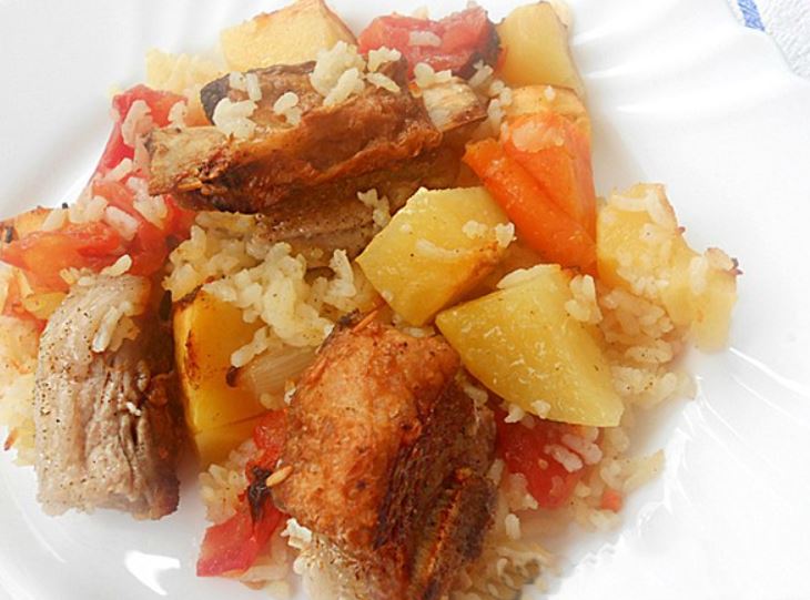 Nauljiti tepsiju pa istresti povrće sa rižom, zatim poredati meso i sve zaliti sa vodom.
