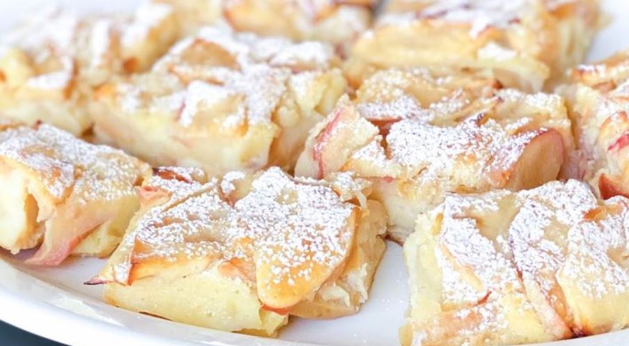 Priprema: Jabuke isjecite na kriške, pa prelijte s malo limunovog soka. Premažite tepsiju maslacem i stavite jabuke. Umutite jaja sa šećerom, pa dodajte mlijeko i još malo sjedinite mikserom. Zatim dodajte brašno i opet umutite. Stavite smjesu preko jabuka.