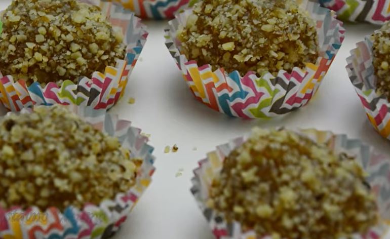 Vlažnim rukama (ovo je važan korak – jer će vam se u suprotnom smesa lepiti za ruke) oblikujemo kuglice željene veličine, uvaljamo ih u mlevene orahe ili šećer u prahu i stavljamo u minjon korpice.