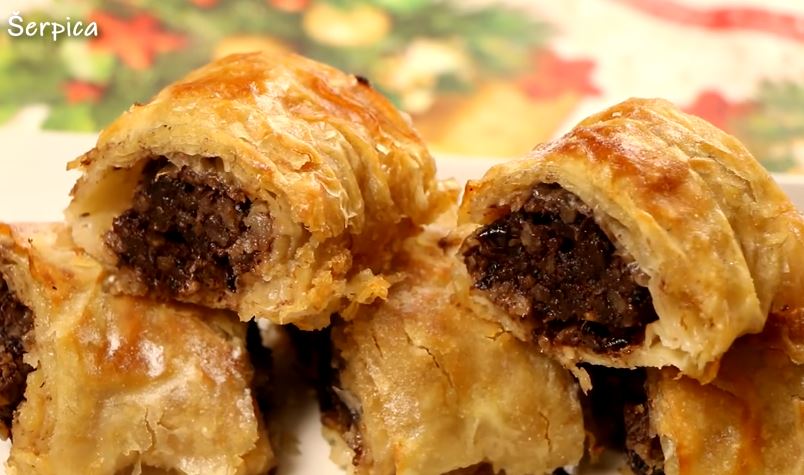Vodom poprskajte prve dve kore, na treću stavite 3 kašike jabuka. Prekrijte 4 korom, popsrkajte vodom pa uz kraj stavite fil od suvih šljiva. Umotajte kao rolat. Podmažite pleh uljem. Pite odozgo premažite uljem, isecite ih pa ostavite deset minuta da stoje. Za to vreme uključite rernu da se zagreje. Pecite ih na 200 stepeni dok ne porumene, oko 35 minuta. Pečene pite prekrijte krpom i osavite da stoji samo pet minuta. Pospite šećerom u prahu. Prijatno!