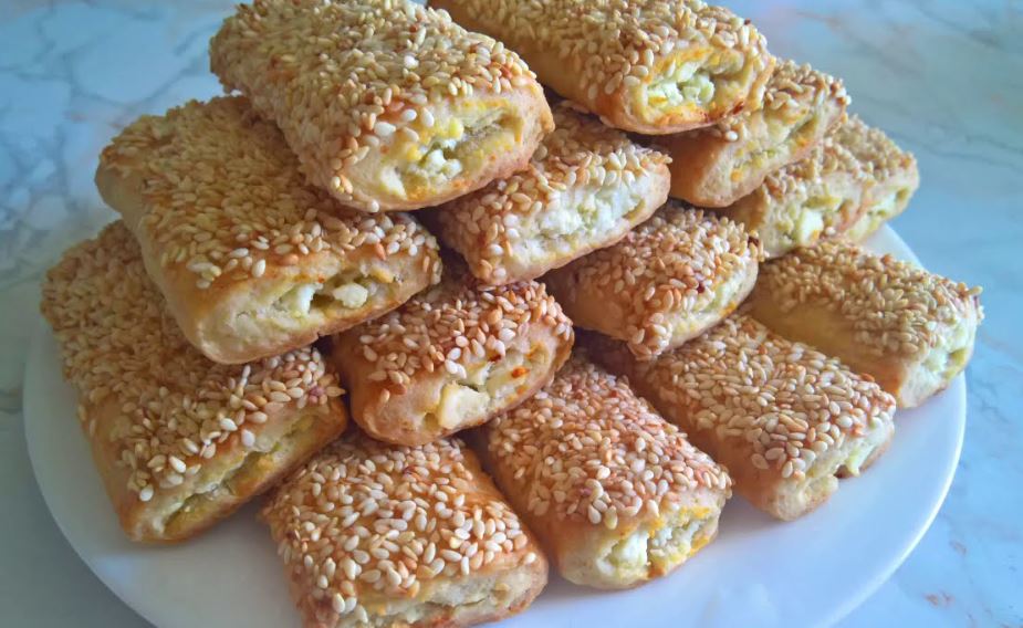 Sir usitnite, pa po dužini svake trake stavite sir. Zatvorite ivice testa i malo prstima spljoštite. Premažite belancetom i isecite štrudle. Zatim svaku uvaljajte u susam. Pecite na plehu obloženom pek papirom na 200°C oko 15-20 minuta.