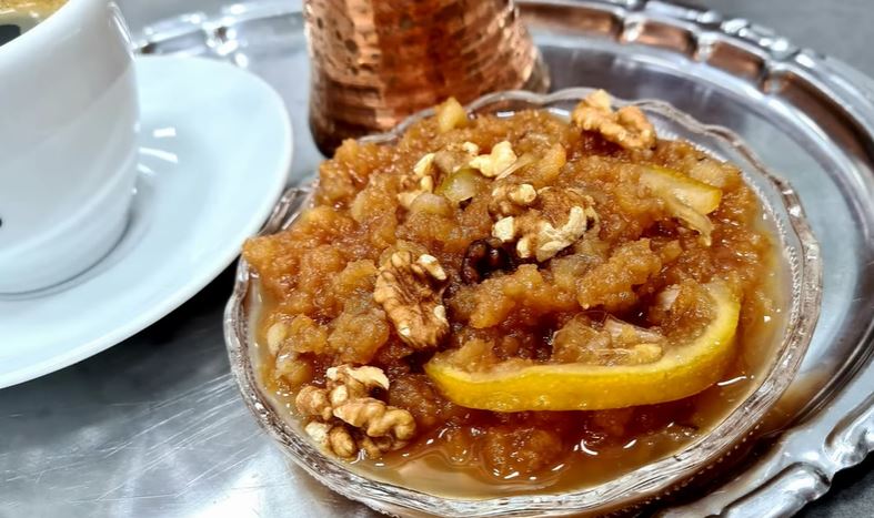 skuvati serbet od vode,secera,vnilin secera ..neka kuva 10 min dok se nenaprave gusti baloni..dodati izrendane dunje i orahe a zatim i limun isecen na kriske .kuvati oko 30 min .nikako mesati vec kruznim pokretima samo serpu prodrmati.