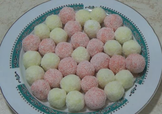 U ohlađen puding dodati kokosovo brašno i aromu vanile i dobro izmešati. Smesu podeliti na dva dela. U jedan deo sipati malo prehrambene boje i umešati. Od smese praviti kuglice i valjati ih u kokosovo brašno.