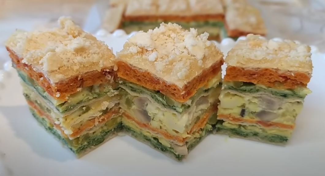Zelena kora pa fil , crvena kora pa fil , pa 50g slanih posnih krekera poredjati krekere na filu odozgo ponovo fil ,pa zelena kora ,pa opet fil i crvena kora.