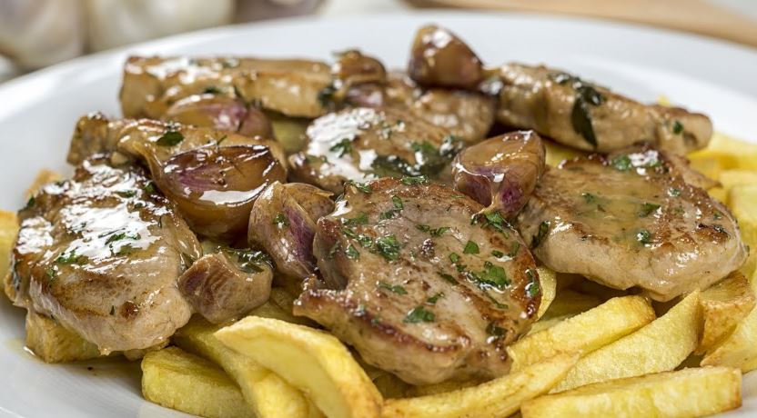 Priprema: Beli luk očisite i presecite po sredini, ali ne do kraja (čenovi treba da ostanu celi). Sa mesa skinite masnoću i isecite šnicle debljine 2 cm. Propržite meso na zagrejanom ulju, pa izvadite. Stavite luk, kratko propržite, pa vratite meso. Sipajte vino i vodu (bujon) i ostavite još 5 minuta da se krčka. Pospite seckanim peršunom.