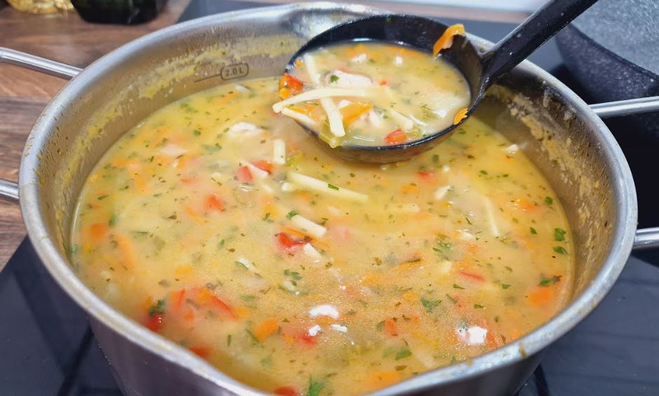 Ostavite da se krčka na laganoj vatri nekih 10 minuta. Dodajte brašno (2 kašike) i dobro promešajte, pa sipajte pileći bujon (200 ml) i dobro promešajte da nema grudvica. Dodajte preostali bujon i kuvajte 10 minuta, poklopljeno. Za to vreme propržite meso, pa ga dodajte u supu, kao i rezanca. Stavite lovorov list i suvi peršun, promešajte i kuvajte poklopljeno još 15 minuta. U gotovu supu dodajte seckani svež peršun.