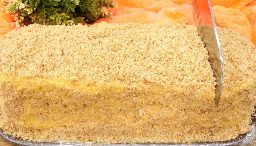 Lisnato testo presečemo na dva dela i poređamo na tacnu. Prelijemo vrelim filom, ponovo stavimo lisnato testo i ponovo premažemo filom i tako sve do utroška lisnatog testa. završite filom. Ostavite u frižideru 8 sati. Preostalo lisnato testo sitno izgnječite i njime prekrijte desert.