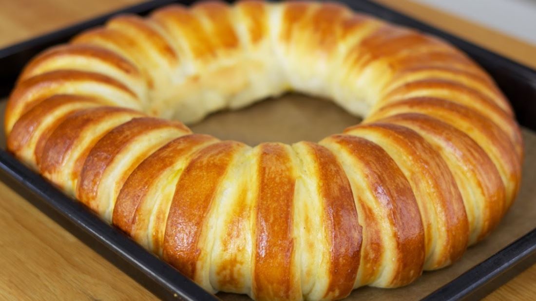 Razvaljajte testo i oblikujte u krug, odnosno spojite dve ivice da se spoje. Prebacite testo u podmazan pleh ili papir za pečenje i ostavite da se diže oko pola sata ili više, u zavisnosti od temperature u kuhinji.