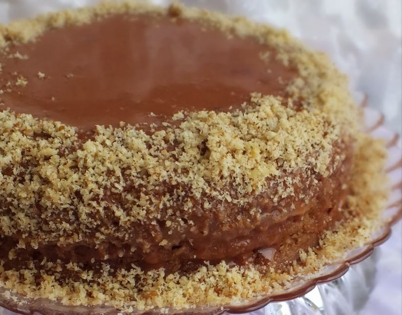 Kada je torta gotova sačekajte par minuta a potom je bukvalno izvrnite na tanjir i prelijte slatkom pavlakom i čokoladom .
