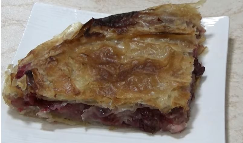 Tepsiju prečnika 30 centimetara podmazati uljem. U tepsiju složiti 4 kore tako da prekriju dno, a da im polovina bude van tepsije. Po korama sipati po 2-3 kašike ulja i vode. 4 kore zgužvati (skupiti) po dužini i poređati u tepsiju. Po korama sipati po 2-3 kašike ulja i vode. Zatim rasporediti trećinu višanja preko kora. Višnje posuti trećinom šećera. Preko svega sipati po 2-3 kašike ulja i vode. Postupak ponoviti još dva puta: 4 zgužvane kore, ulje i voda, višnje, šećer, ulje i voda. Na kraju poređati još jedan sloj zgužvanih kora, posuti uljem i vodom i zatvoriti krajevima koji su ostali van pleha.