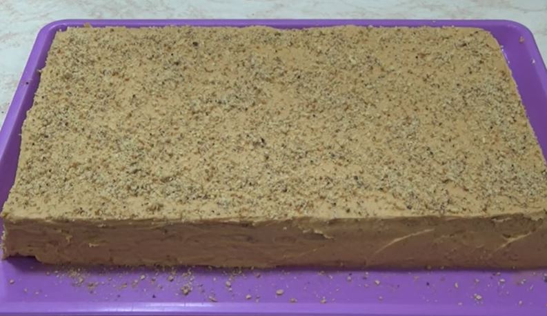 Keks umakati u sok i ređati na tacnu kao prvu koru. Preko keksa naneti prvi sloj fila. Preko fila poređati drugi sloj keksa umočenog u sok. Tako raditi do kraja, da bude četiri sloja keksa i četiri sloja fila. Ostaviti malo fila da se torta premaže sa strane. Tortu na kraju posuti mlevenim orasima i staviti u frižider da se dobro ohladi.