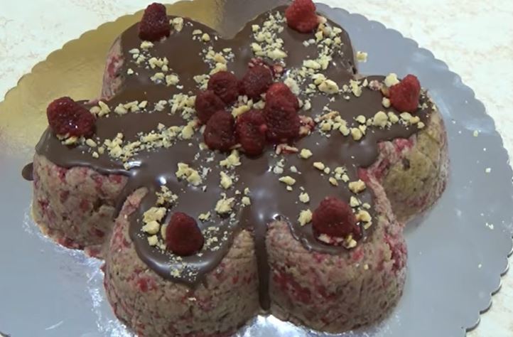 U istopljeni margarin dodati šećer u prahu i dobro umešati. Dodati mleveni keks, mlevene orahe i iseckanu čokoladu za kuvanje i umešati da se smesa sjedini. U smesu sipati sok i dobro izmešati. Na kraju dodati maline i polako umešati. Smesu sipati u okrugli kalup prečnika 20 cm (ili u kalup drugog oblika, slične zapremine). Kalup obložiti providnom folijom. Tortu prekriti folijom i ostaviti u frižideru da se stegne. Istopiti čokoladu sa uljem. Ohlađenu tortu izvaditi iz kalupa i preliti glazurom. Po želji ukrasiti orasima i malinama.