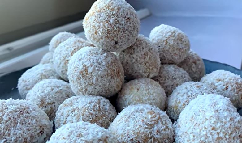 Uksune i lagane kuglice od kokosa, griza, lešnika i keksa, koje se pripremju za čas.