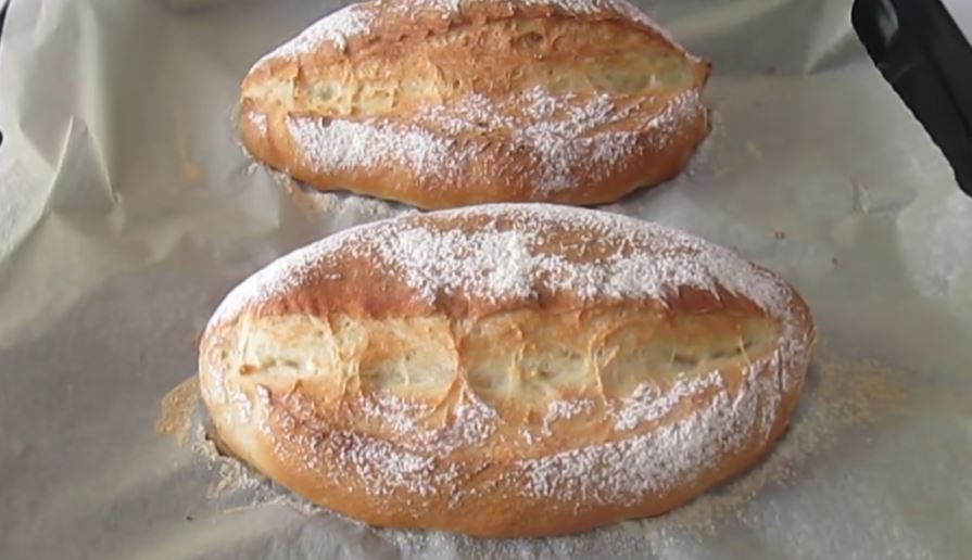 Od svake loptice oblikujte valjak. Stavite na pleh obložen pek papirom i pokrijte, pa ostavite 20 minuta da odstoji. Zasecite po sredini, pa premažite vodom i pospite brašnom. Na dno rerne stavite posudu sa vodom, a pleh stavite na rešetku. Pecite u zagrejanoj rerni na 200°C oko 35 minuta.