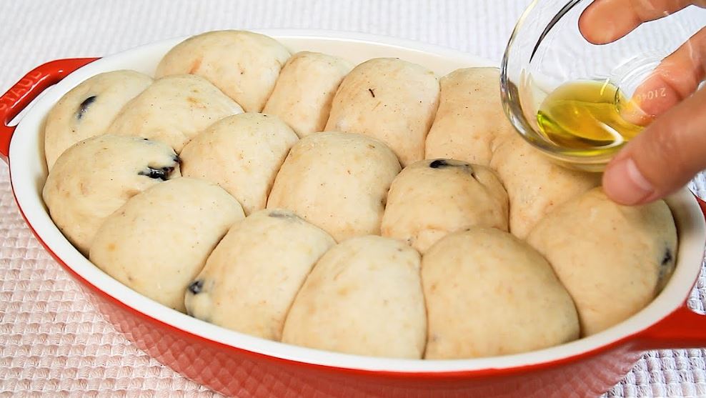Pripremite posudu za pečenje ili tepsiju. Premažite uljem ili puterom, pa pospite malo brašna. Istresite testo na radnu površinu i premesite. Rastanjite malo pomoću oklagije pa rastanjite rukama na oblik pravougaonika otprilike. Na testo rasporedite brusnice. Urolajte testo sa duže strane. Isecite rolat na 16 delova pa formirajte loptice. Njih stavljajte u pripremljen pleh jednu do druge. Pokrijte i dižite 30-45 minuta. Premažite loptice maslinovim uljem (opciono). Pecite 15 minuta na 180C. Posle pečenja stavite na rešetku da se ohladi.