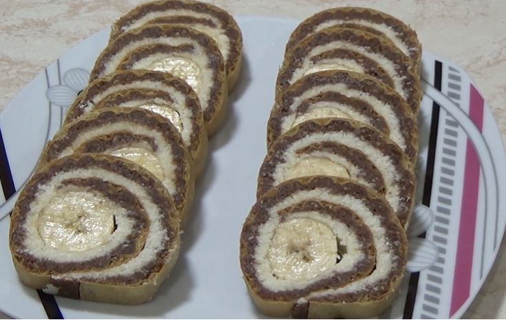 Omekšalu oblandu prvo nafilovati tamnim filom. Preko tamnog fila razmazati beli fil. Duž ivice poređati cele banane i uviti u rolat. Rolat ostaviti da malo odstoji pre sečenja.