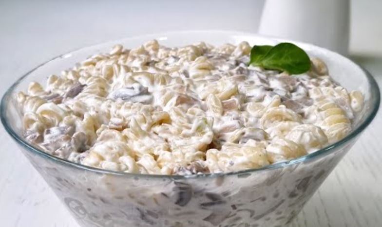Na srednjoj temperaturi na 2-3 kašike ulja prodinstati sitno seckan praziluk. Do se luk dinsta očistite šampinjone i isecite na sitnije komade. Nakon 10-ak minuta dinstanja luka dodajte i šampinjone, 1/4 kašičice soli, suvi začin, origano, biber i dinstati još 10-15 minuta dok voda koju su pustili šampinjoni ne ispari. Šampinjone dodati u oceđene makarone, promešati i poklopljeno ostaviti da se potpuno ohladi (1h). Na svakih 15-ak minuta protresite šerpu tako da se makarone rasture. Tako ćete sprečiti njihovo lepljenje. Ukoliko to budete radili kašikom postoji šansa da će se makarone malo izgnječiti.