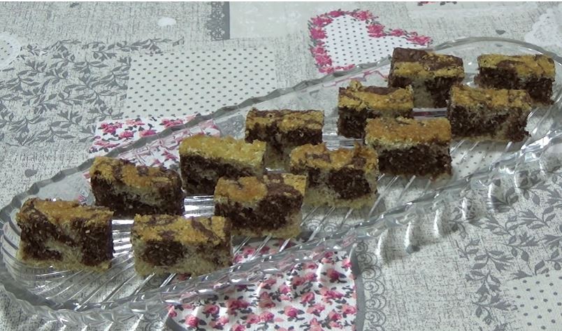 Kalup veličine 20×20 obložiti papirom za pečenje i naizmenično sipati belu i braon smesu. Kolač staviti u zagrejanu rernu na 200 stepeni da se peče od 20 do 25 minuta.