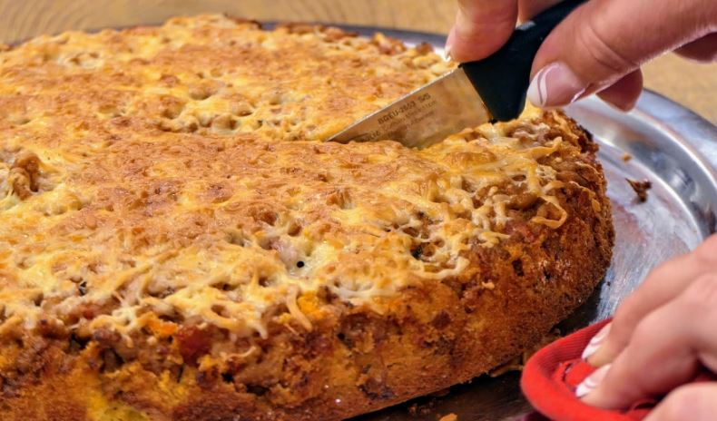 Način pripreme: Pržite luk 5 minuta na umerenoj vatri (7. stepen). Dodajte dimljenu slaninu, pržite 5 minuta na umerenoj vatri (7. stepen). Dodati mleveno meso, pržiti 5 minuta na umerenoj vatri (7. stepen). Dodajte seckani paradajz i začinite crnim biberom, crvenom paprikom, kimom i bosiljkom. Ostavite 1 minut na umerenoj vatri (7 stepena). Mljeveno meso sipamo u okrugli pleh prečnika 22 centimetra.