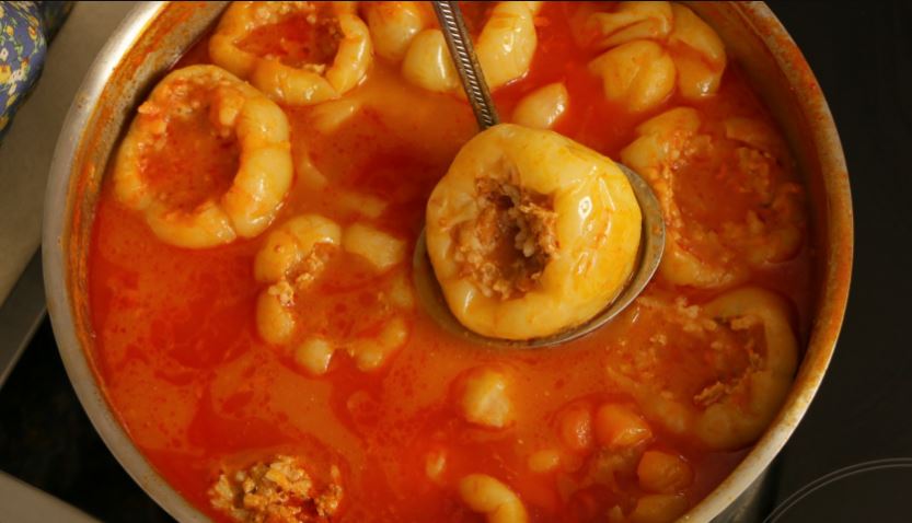 Složite u šerpu, prelijte kuvanim paradajzom i vodom.