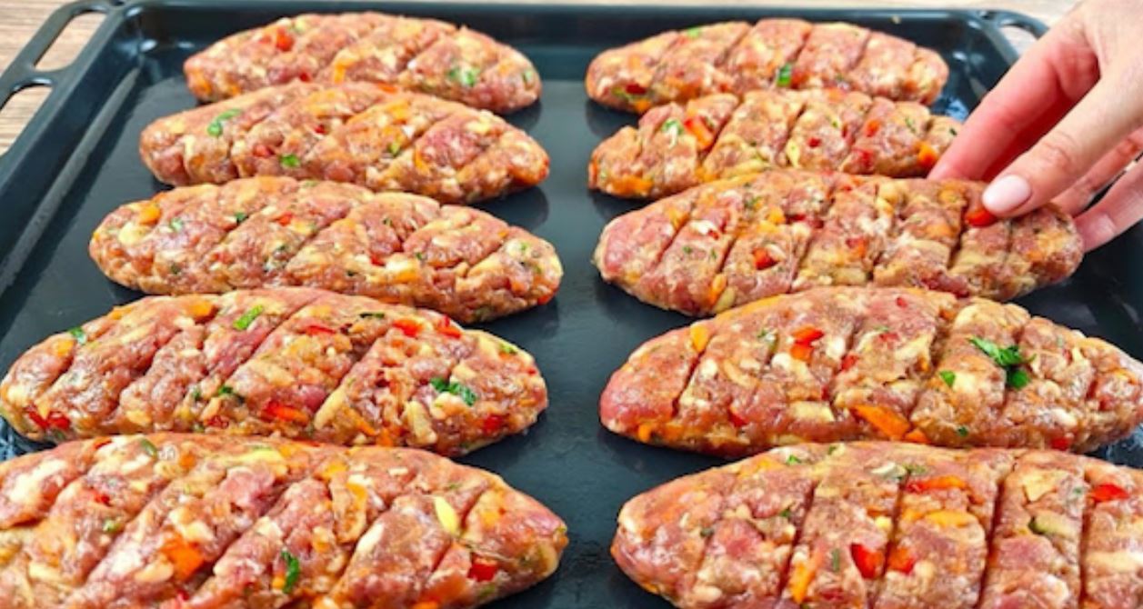 Od ovako pripremljene smese formirajte velike ćufte (kao što je prikazano na video). Ređajte u pleh obložen papirom za pečenje. Uzmite kašiku i sa strane napravite male rezove na površini mesnih okruglica.