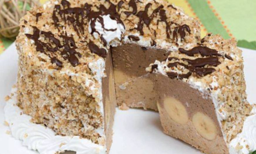 450 g mlevenog keksa, 250 g mlevenih oraha, 1,5 kg banana, 4 žumanceta, 250 g šećera u prahu, 250 g putera, 100 g čokolade za kuvanje, 3 dl slatke pavlake, 3 dl soka od pomorandže, sok od jednog limuna
