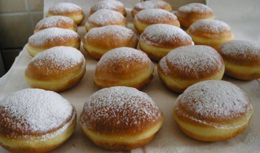 1 kg glatkog brašna, 1 kocka svježeg kvasca, 1 prašak za pecivo, 1 vanilin šećer, 6 žumanjka, 100 grama šećera, 1/2 l mlijeka, 70 grama maslaca, 1 dcl kiselog vrhnja, 2 žlice ruma, naribana limunova korica, malo soli, ulje za prženje, marmelada od marelice, šećer u prahu za posipanje