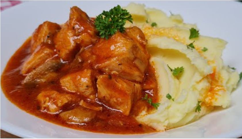 Iseckati luk I dinstati na zagrejanom ulju dok ne postane staklast. Dodati piletinu isečenu na kockice. Posoliti, začiniti i pobiberiti. Dinstati dok ne ispari tečnost. Kada ispari tečnost dodati šampinjone I nastaviti dinstanje dok ima tečnosti potom dodati slatku papriku, paradajiz sok I vodu. Dodati izgnječen beli luk i origano. Razmutiti gustin sa malo vode i dodati u sos. Krčkati još 30 min na laganoj vatri uz povremeno mešanje.