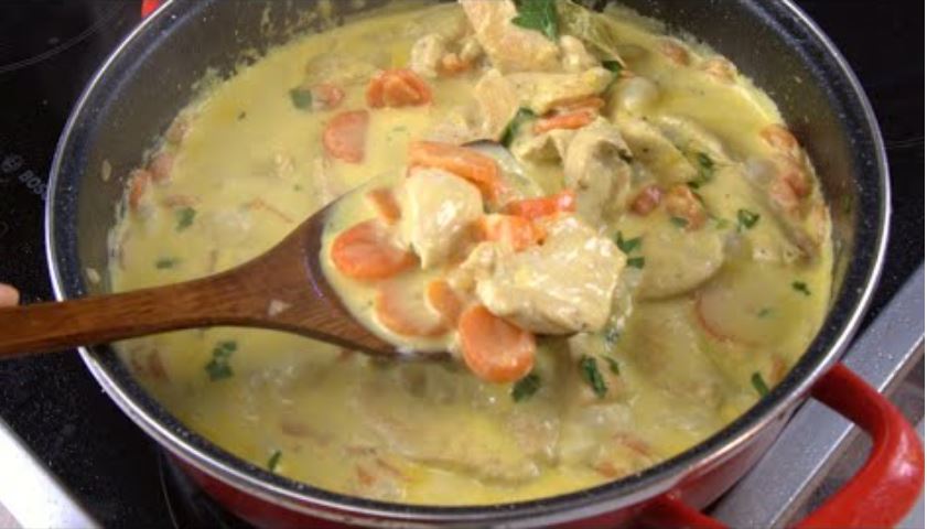 Priprema: Isecite meso na trake ili kockice, pa posolite i pobiberite. Kratko ispržite, pa izvadite iz tiganja. U isti tiganj dodajte seckani crni i beli luk, pa kada se malo proprži dodajte šargarepu isečenu na kolutove. Sipajte bujon i začine. Kuvajte dok šargarepa ne omeška, pa sipajte pavlaku za kuvanje. Promešajte i vratite meso. Začinite još malo, ako je potrebno, i kuvajte još 10-ak minuta.