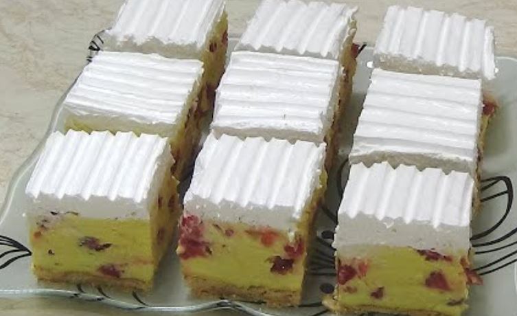 Preko ohlađene kore rasporediti sav fil. Umutiti šlag sa kiselom vodom. Preko kolača naneti šlag. Staviti kolač u frižider da se ohladi.