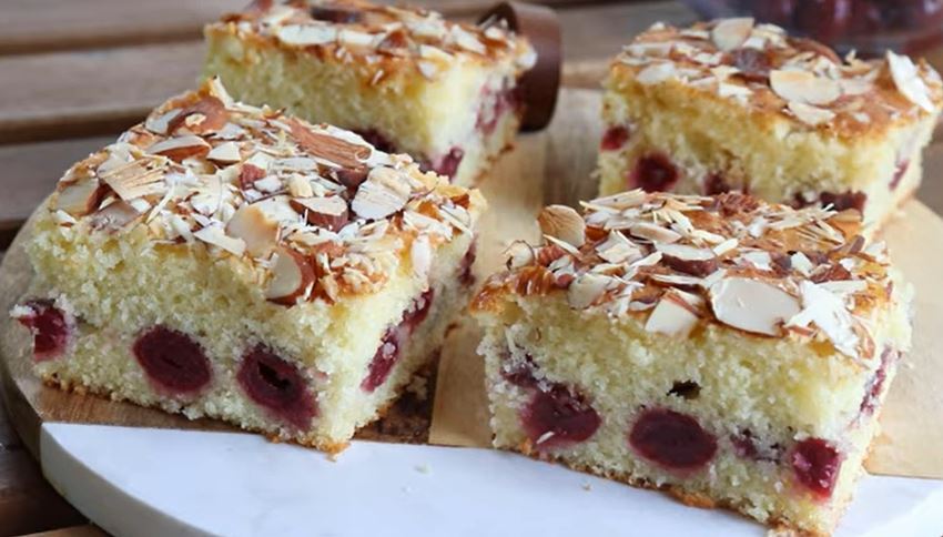 Jednostavan biskvitni kolač s višnjama i bademima. Tijesto je mekano, a višnje i hrskavi bademi su odličan dodatak.