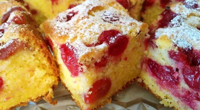 Pleh veličine 30×20 obložiti pek papirom sipati smesu i odozgo poredjati višnje i trešnje. Malo ih prstima gurnuti u testo da ne budu sve na vrhu.