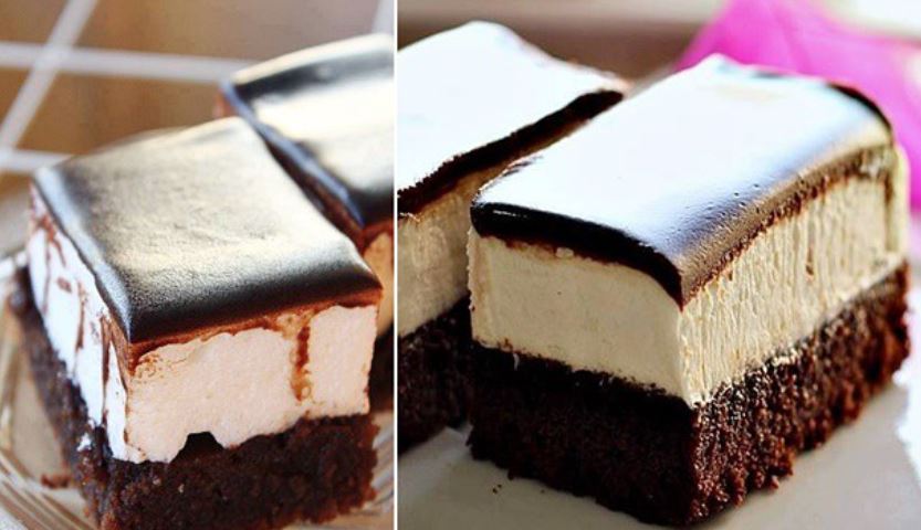 Kolač izvadimo iz rerne i prelijemo čokoladnom glazurom. Odmah ga i režemo na kocke.