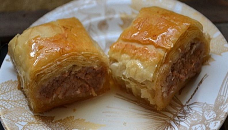 Staviti 4-5 jufki jednu na drugu pa ih premazati puterom, i onda posuti smjesom kao na slici i saviti jufku kao za rolat.