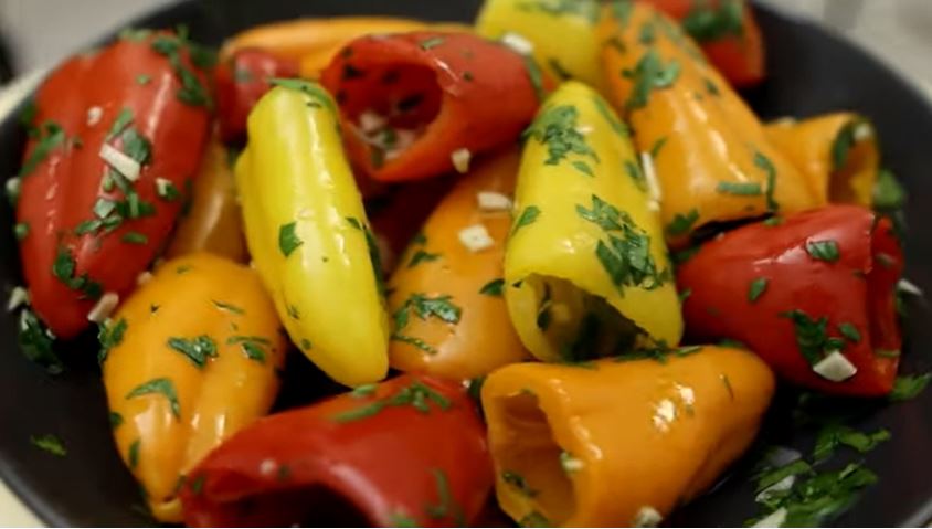 Kuvajte dok se šećer i so ne istope pa dodajte paprike. Kuvajte 8 minuta potom paprike izvadite i dodajte im seckan beli luk i peršun. Servirajte.