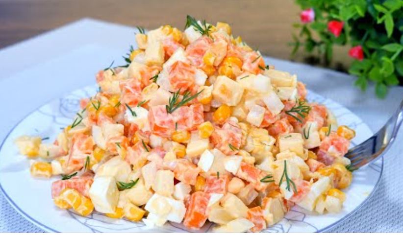 Priprema: Šargarepu skuvajte, a zatim isecite na kockice, kao i jabuku i jaja. Crni luk iseckajte, pa dodajte šećer, so, vodu i sirće i kratko marinirajte. Dodajte u salatu kao i kukuruz. Sve lepo sjedinite sa majonezom.