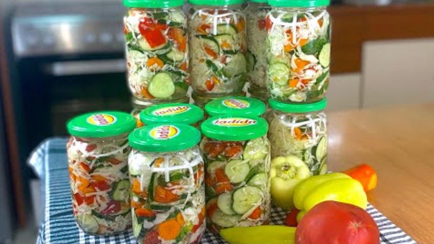 Povrce iseckati, zatim redjati u sterilisane tegle. I svaku teglu dodati po jednu kašičicu soli, zatim po jednu kašičicu kristal šećera, nakon toga po dve supene kašike sirćeta. Naliti tegle vrelom vodom do kraja. Izvršiti pasterizaciju. Prijatno!