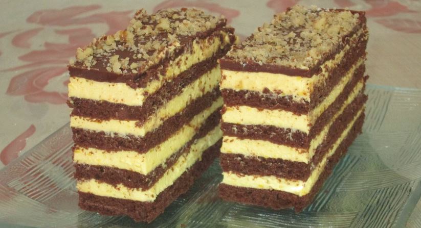 Masu podijeliti na 4 jednaka dijela i svaku koru premazivati i redati jednu na drugu.
